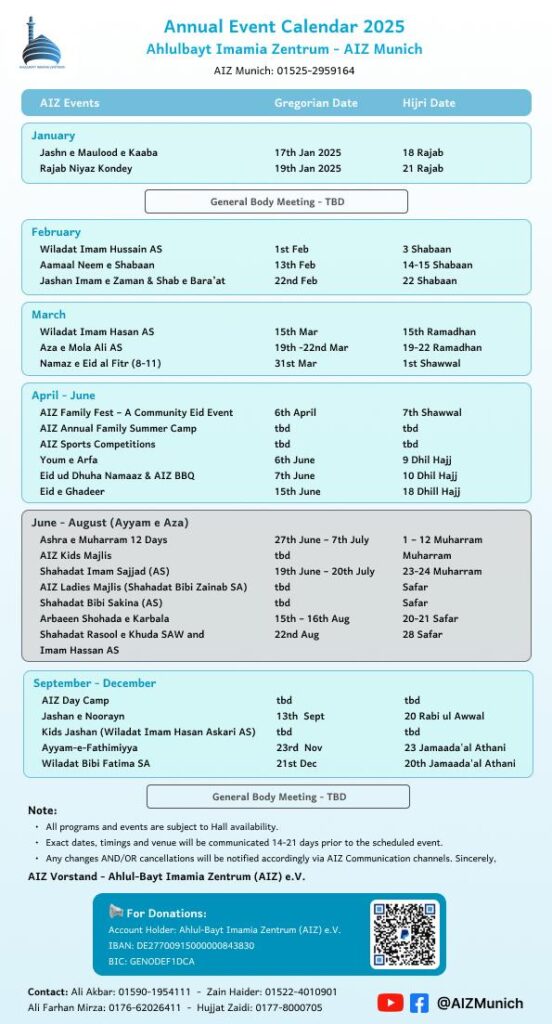 Alhamdulillah, our Event Calendar for 2025 (1446/1447 AH) is now finalized. Please find the attached photo for details.