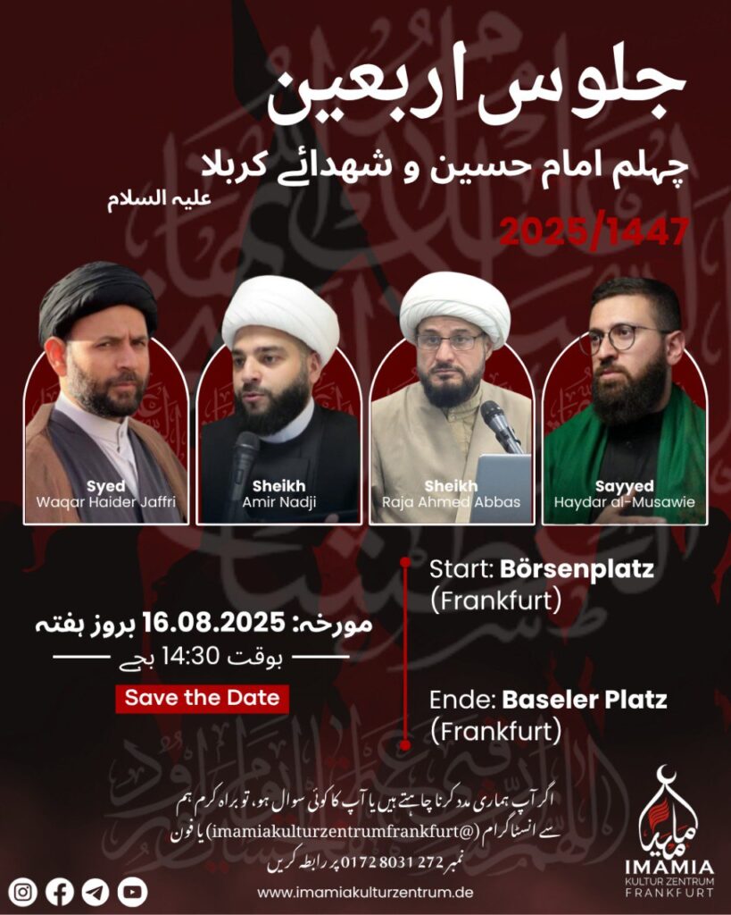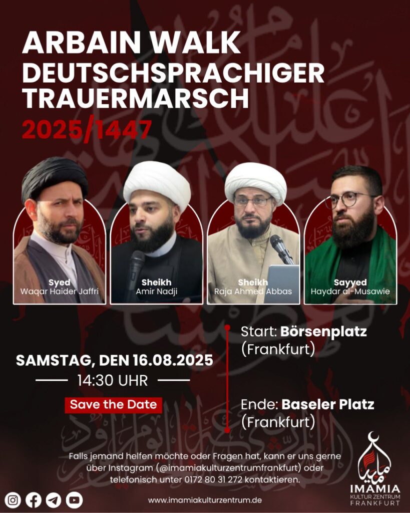 Alhamdulillah, auch in diesem Jahr dürfen wir wieder gemeinsam auf die Straße gehen, um die zeitlose Botschaft von Imam Hussain (as) zu verbreiten. Wir laufen für Imam Hussain – mit Imam Hussain.