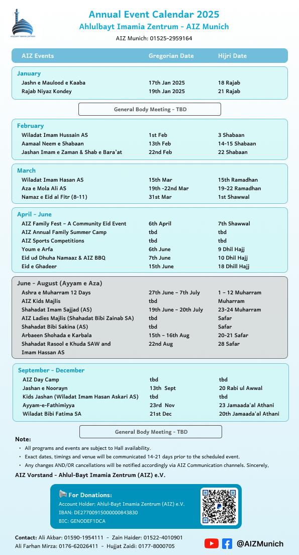 Alhamdulillah, our Event Calendar for 2025 (1446/1447 AH) is now finalized. Please find the attached photo for details.